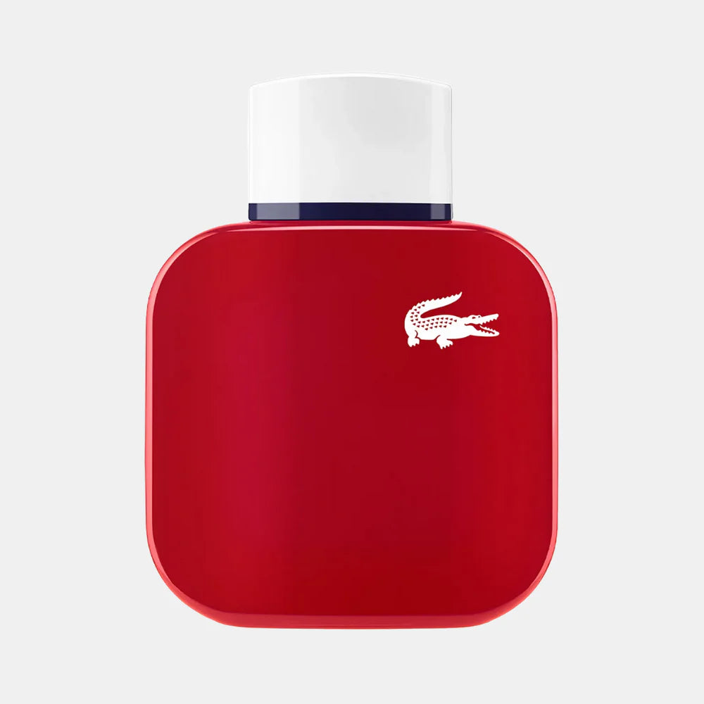 El frasco rojo, adornado con el clásico cocodrilo de Lacoste, y una tapa blanca con detalles en azul, evocan la frescura y estilo característicos de la marca.